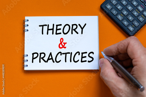 Theory and practice symbol. Businessman writing words 'Theory and practice' on white note. Black calculator. Beautiful orange background. Business, theory and practice concept. Copy space.