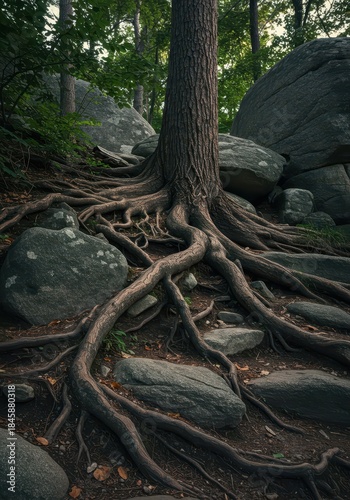 Thick, woody tree roots gripping large gray boulders on a steep hillside, demonstrating powerful natural erosion control and ancient forest stability, Root, nature, strength