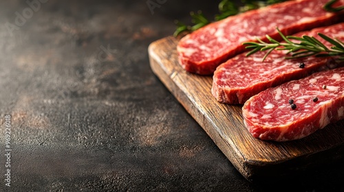Thin slices of cured prosciutto ham with fresh rosemary sprigs on a wooden board, against a soft, blurred background.