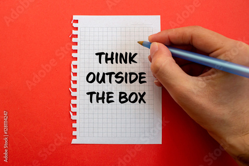 Think outside the box message written on white paper on red background. Conceptual think outside the box symbol. Copy space.