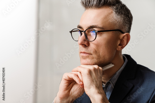Thinking grey man wearing eyeglasses holding pen and looking forward