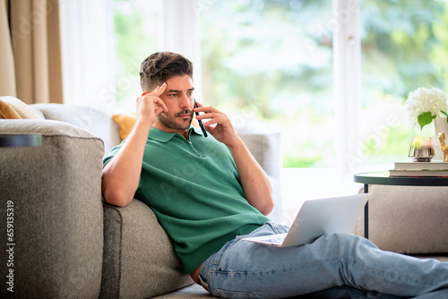 Thinking man sitting on the sofa at home and using laptop and smartphone