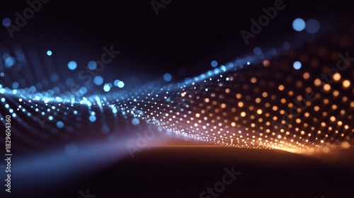This abstract digital wave features a mesmerizing blend of blue and orange lights, creating a dynamic representation of technology and innovation that captivates the viewer.