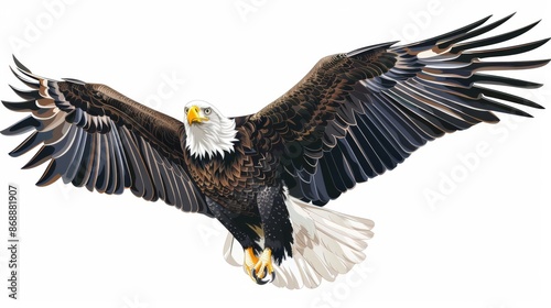 This artistic representation captures the bald eagle mid-flight in an action pose, highlighting its impressive wingspan, fierce gaze, and the dynamic movement of this birds in the wild.
