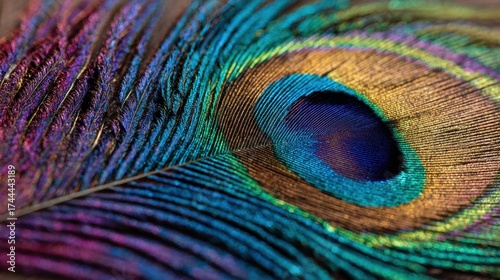 This close-up view captures the striking colors and complex patterns of a peacock feather highlighting natures intricate design. The vibrant hues create a visual feast for the eyes.