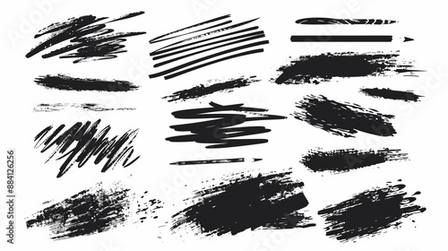 This collection of black brush strokes displays diverse forms and textures on a white background. It serves as a versatile tool for artistic and design purposes.