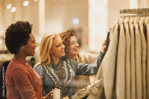 shopping, friends, woman, smiling, sale, fun, buying, looking, together, fashion, clothing, store, retail, freedom, relaxation, assistance, choice, cheerful, sale, bag, happy, laughing, togetherness, black, woman, three, joy, people, beautiful, shopaholic, caucasian, african american, multiracial, group, mature, african, ethnicity, female, adult, person, happiness, lifestyle, avocation, boutique, fashionable, consumerism, horizontal