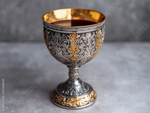 This holy chalice, adorned with intricate designs, is filled with wine, symbolizing the Eucharist and representing the spiritual unity in Christian rituals