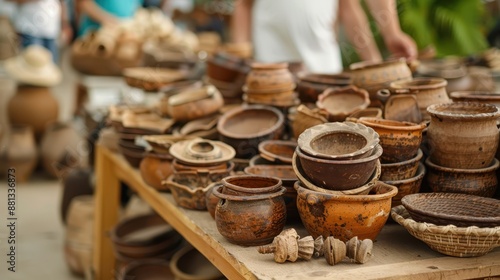 This image depicts a variety of handmade rustic clay pots and pottery neatly arranged on a market stall, highlighting traditional craftsmanship and market culture.