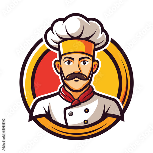 This image features a smiling cartoon chef wearing a white chef hat and a red neckerchief, he is in a circle with yellow and red.