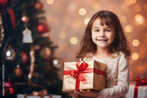 This image features a smiling girl near a decorated Christmas tree, holding a gift box with joy.