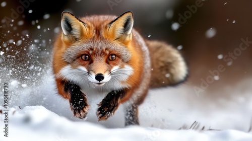 fox, snow, running, agility, freedom, beauty, landscape, vibrant, fresh, nature, wildlife, energy, adventure, exploration, movement, chase, survival, winter, fur, predator, wilderness, forest, eye, ear, paw, blur, cold, white, serene, alert, playful, enthusiastic, joyful, winterly, frost, animal, mammal, trot, lively