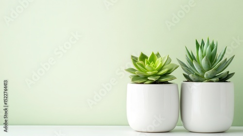 This image features two vibrant succulents in minimalist white pots, showcasing the beauty of nature and simplicity against a calming green backdrop for aesthetic appeal.