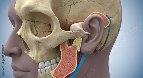 anatomy, bone, skull, ear, lower jaw, teeth, eye, face, profile, biology, medicals, health, jaw, cheek, temporal, cartilage, muscle, vein, artery, structure, illustration, model, diagram, inside, outside, view, perspective, section, detailed, close, front, back, side, human, head, body, sinus, cavity, hearing, complex, artistic, realistic, render, study