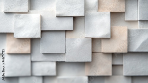 This image showcases an abstract arrangement of white and beige textured squares overlapping on a wall, creating a unique and modern artistic composition.