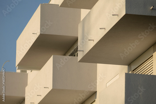 This is a detailed closeup view of a modern building that features balconies prominently arranged with a vibrant blue sky serving as the backdrop