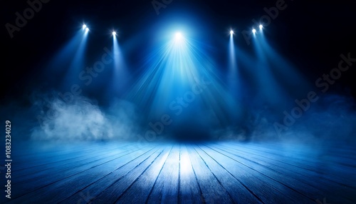 This is an illuminated stage with scenic lights and smoke. Blue modern spotlight with smoke