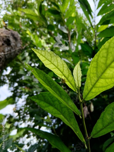 This is an upward-looking, close-up photograph focusing on the new growth of a young plant in a lush outdoor setting.
