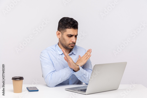 This is the end! Strict male boss sitting office workplace, crossing hands showing x sign stop gesture to laptop screen, finishing video call, warning of troubles. indoor studio shot, white background