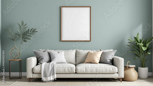 This living room exudes sophistication with a wall painted in a subtle eucalyptus tone. A stylish sofa offers a comfortable seating area, while an awaiting poster frame adds a personal touch