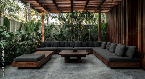patio, luxury, pergola, wooden, furniture, rattan, tropical, plant, garden, oasis, relaxing, modern, serene, greenery, design, resort, seating, retreat, comfortable, decor, lounge, nobody, architecture, outdoors, nature, summer, tranquil