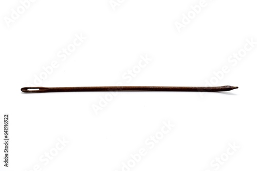 This mattress thread needle made of metal looks rusty and was photographed on the isolated white background
