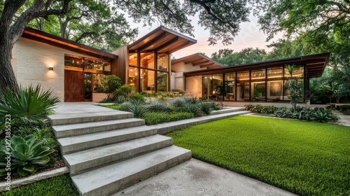 house, architecture, modern, landscape, lighting, garden, tree, plant, flower, grass, pathway, step, stair, deck, structure, dusk, building, pool, patio, water, twilight, property, real estate, residential, luxury, sky, home, evening