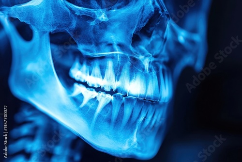This photo showcases a blue xray of a skull highlighting the intricate details of the teeth A detailed view of human teeth Xray film .