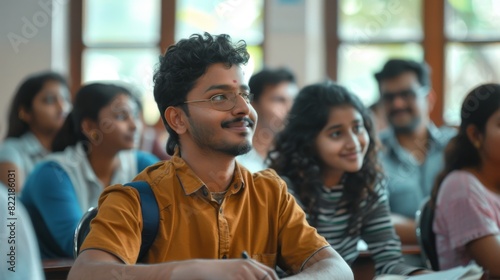 This picture portrays a multiethnic Indian man acquiring new academic skills with others in a formal adult learning setting. A formal adult learning activity has been undertaken by diverse mature