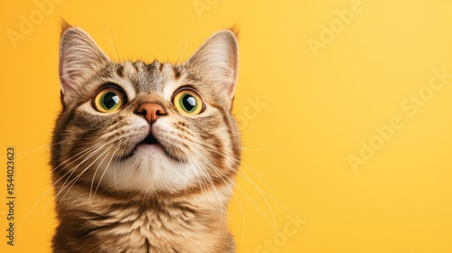 This portrait features a curious cat with striking green eyes gazing upwards, beautifully highlighted against a vibrant yellow background, invoking a sense of wonder and curiosity.