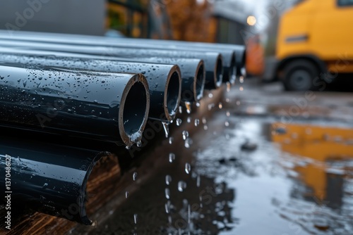 This striking image features a series of shiny black pipes with water droplets, set in an industrial environment, highlighting the stark contrast and functionality.