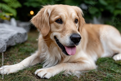 This stunning golden retriever showcases its playful side as it lounges on the grass in a beautiful outdoor environment, reflecting a sense of joy and companionship.