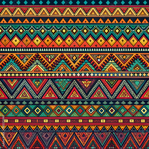 This vibrant. seamless pattern features a colorful and intricate tribal design.