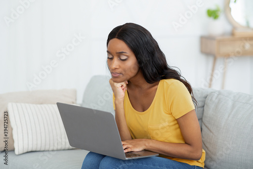 Thoughtful African American lady using laptop to watch educational video or participate in webinar from home