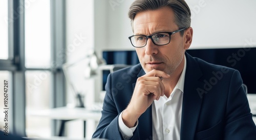 businessman, office, thinking, modern, decision, confidence, professional, thoughtful, workspace, indoor, caucasian, middle-aged, goggles, suit, sharpened, strategy, planning, executive, working, contemplation, management, business, career, leadership, corporate, serious, concentration, analysis, ambition, idea, motivation, determination, dedication, success