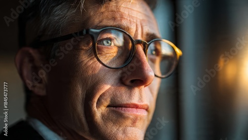 Thoughtful businessman in office sunlight through window portrait blurred background mature professional