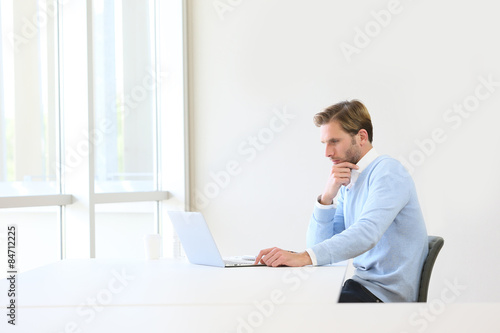 Thoughtful businessman working on laptop in business room