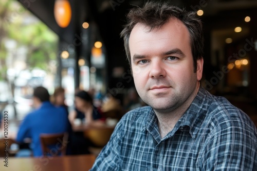 man, cafes, portrait, indoor, casual attire, people, adult, looking, expression, emotion, deep thought, relaxation, ambience, lifestyle, sitting, table, creative, hot drink, leisure, friendship, social, urban, background, smiling, drink, communication, environment, fashion, observation, male, day, modern, thoughtful, candid, human, sharpened, contemplation, living, atmosphere, casual clothes, mood, interaction, everyday, character, calmness, profile, enjoyment, natural light, connection