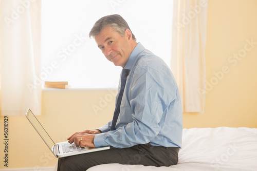 50s, mature adult, man, male, caucasian, indoor, businessman, brown eyes, dark eyes, grey hair, short hair, attaching, shirt, bedchamber, bed, morning, sunlight, home, house, household, homelike, apartment, domicile, abode, lifestyle, sitting, concentrated, thoughtful, serious, focused, concentrating, using, typing, laptop, notebook, technology, computer, wireless, portrait, working