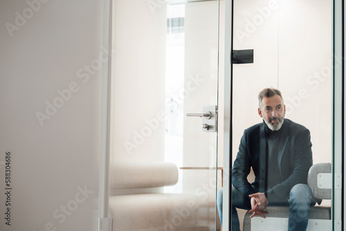 thoughtful, mature, businessman, sitting, office, individuality, copy space, 1, people, adult, business, man, day, occupation, job, pensive, door, graying, thinking, contemplation, caucasian, looking, transparent, beard, male