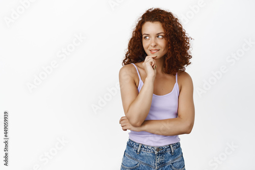 Thoughtful stylish redhead woman, look and ponder, with coquettish face expression at left side, thinking, tempted to try something, white background