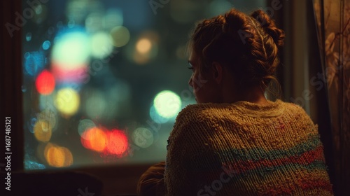 woman, female, person, half face, profile, thoughtful, contemplative, pensive, solitude, loneliness, night, evening, city lights, bokeh, urban, indoor, cosy, sweater, warm clothes, coiffure, sitting, blur, dark, mood, calm, peaceful, quiet, lifestyle, contemplation, relaxation, home, casual attire, introspective, sharpened, soft light, atmosphere, background