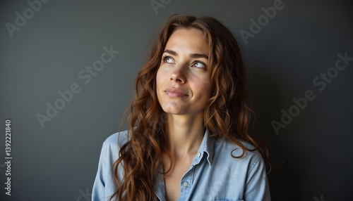 woman, female, portrait, curly hair, red hair, auburn hair, looking up, thinking, thoughtful, pensive, dreamy, studio shot, grey background, casual clothes, beauty, skincare, closeup, head shot, attractive, beautiful, indoor, light, peaceful, calm, serene, one person, hope, imagination