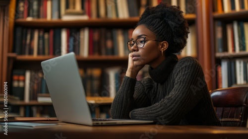Thoughtful Woman Working on Laptop in Library