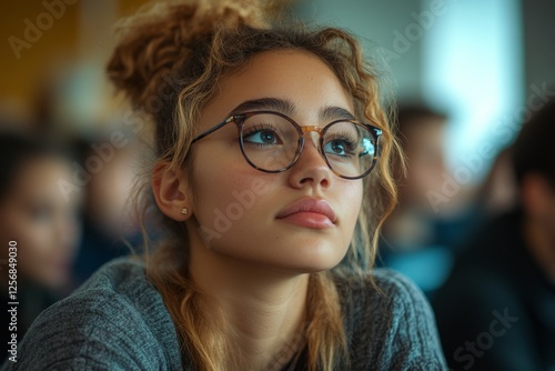 woman, girl, young, adult, female, portrait, face, closeup, goggles, eyewear, spectacle, thoughtful, pensive, contemplating, looking, up, thinking, curious, intelligent, student, learning, education, cognition, wisdom, beauty, pretty, attractive, casual attire, indoor, people