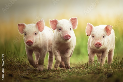 Three adorable piglets in farm field under blue sky and green grass, conveying warmth and joy in natural setting