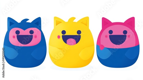 Three adorable pixelated cat characters in blue yellow and pink, isolated on white background, digital art design featuring cute expressions and playful textures