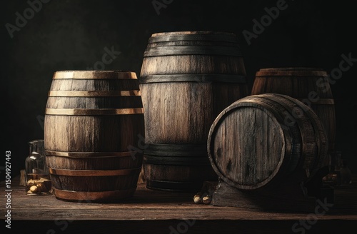 Three aged wooden barrels, varying sizes, rest on a dark wood surface against a moody backdrop; subtle lighting emphasizes texture and age