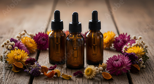 Three Amber Glass Dropper Bottles Surrounded by Dried Colorful Flowers on Rustic Wood Table