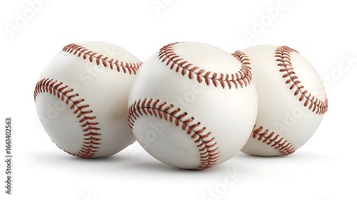 Three baseballs with red stitching aligned together on a clean white background